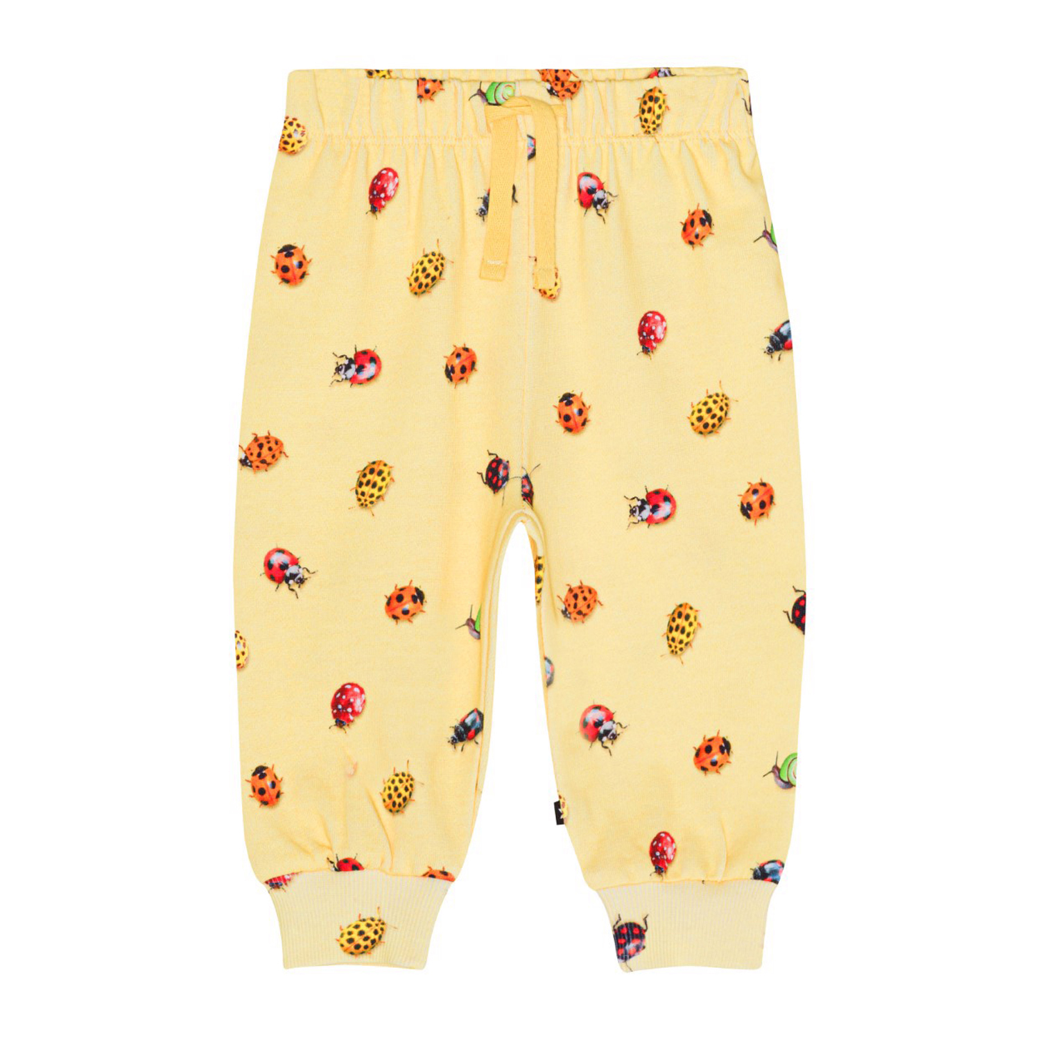 Gelbe Jogginghose für die Kleinen aus Öko-Baumwolle. Die Hose hat einen Gummizug und Bänder in der Taille sowie gerippte Kanten an den Beinen. Die Hose lässt sich leicht an- und ausziehen und bietet viel Bewegungsfreiheit. Die Hose hat einen Allover-Print aus süßen bunten Marienkäfern und Schnecken. Kombinieren Sie die Hose mit einem passenden Pullover und erhalten Sie ein weiches Sweat-Set.
