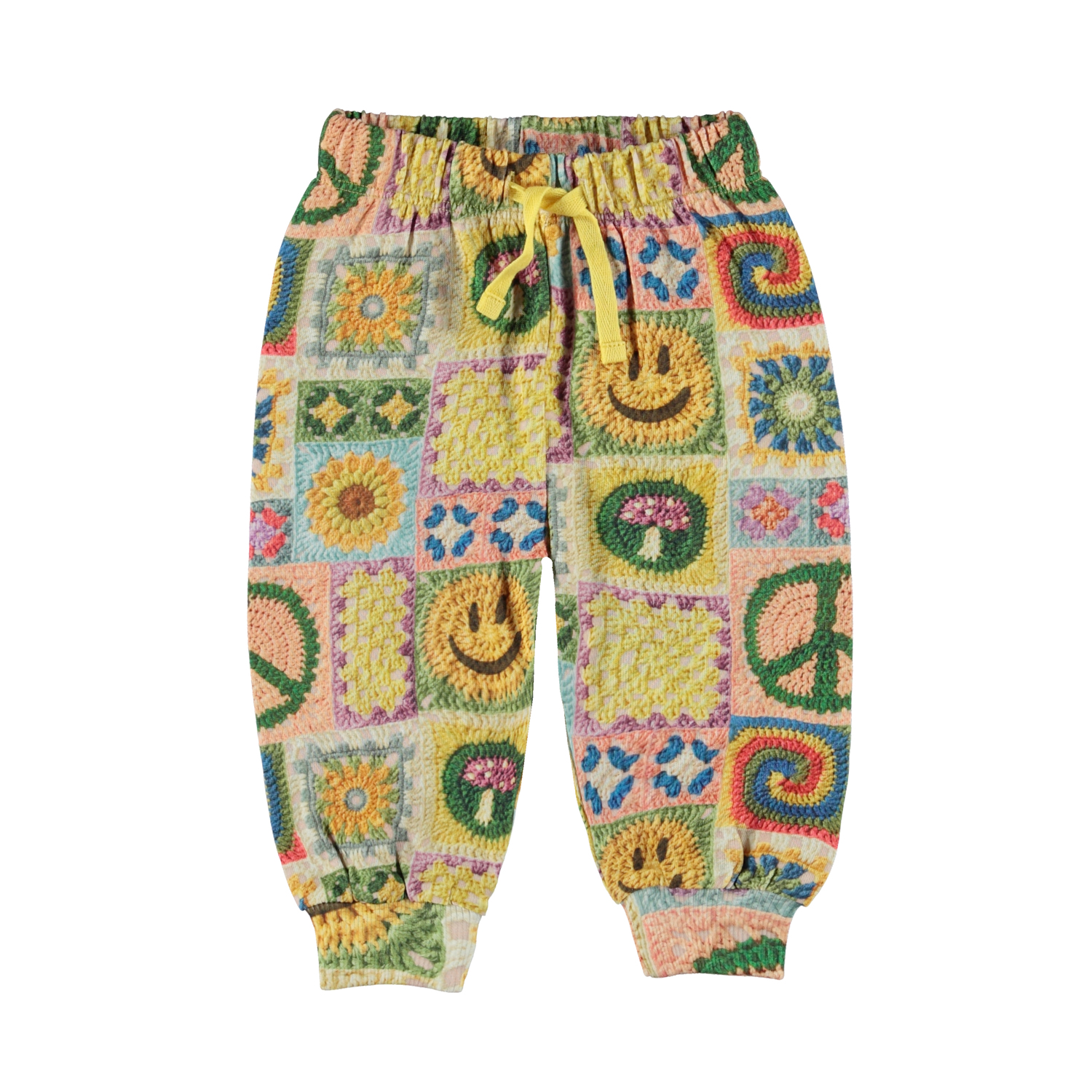 Mehrfarbige Hose mit Allover-Häkeldruck für die Kleinen. Bei diesem Druck hat Molo selbst gehäkelt um unsere eigene gedruckte Interpretation des beliebten Trends zu kreieren. Du kannst Regenbögen, fröhliche Gesichter, Pilze, Sonnenblumen und Friedenszeichen finden. Eine Aufforderung, die Häkelnadel selbst zu finden und mit eigenen Farben und Mustern zu experimentieren und der Fantasie freien Lauf zu lassen. Diese Hose besteht aus 100% Baumwolle, hat einen Gummizug und Bänder in der Taille und Rippbündchen an den Füßen. Kombinieren Sie evt. die Hose mit dem Shirt Disc im gleichen Aufdruck für das perfekte Set.