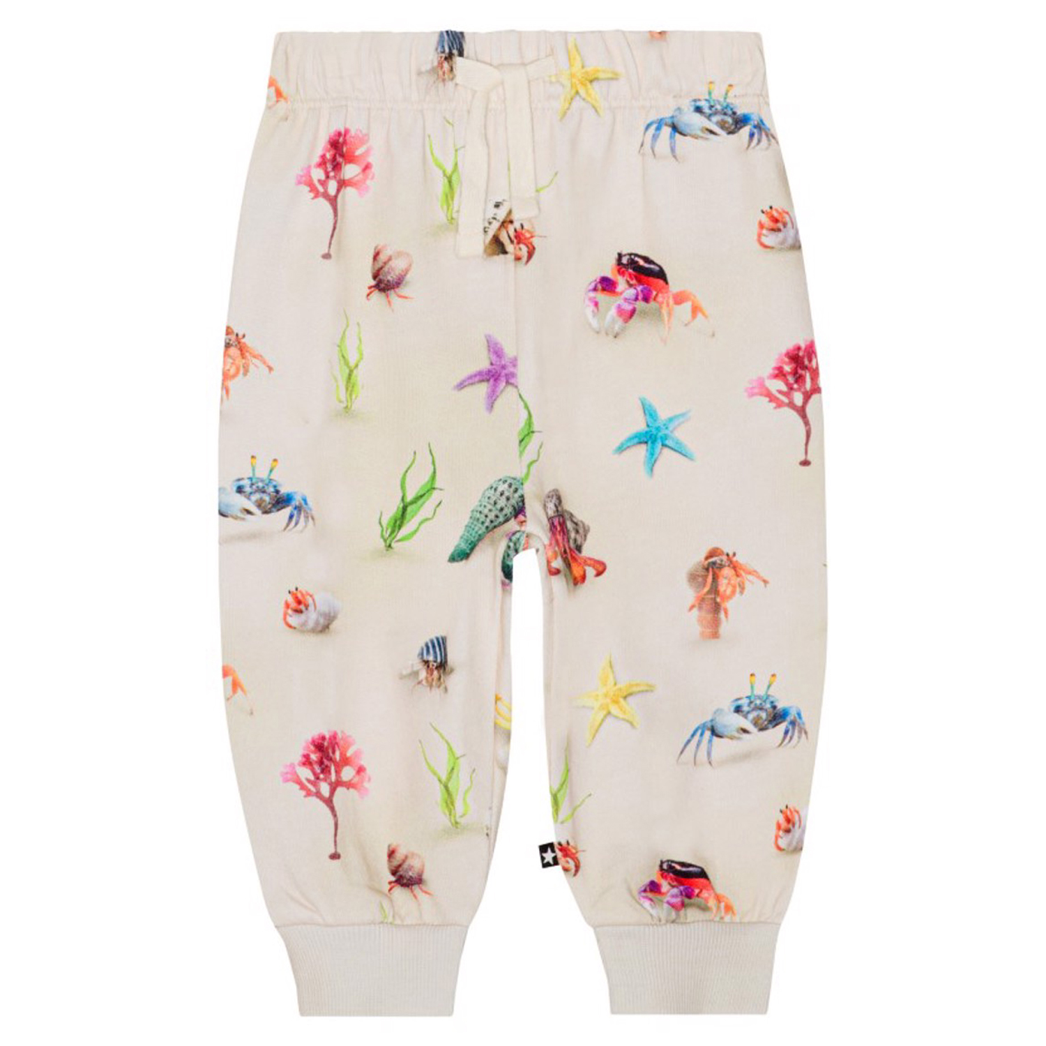 Sandfarbene Jogginghose für die Kleinen aus Öko-Baumwolle. Die Hose hat einen Gummizug und Bänder in der Taille sowie gerippte Kanten an den Beinen. Die Hose lässt sich leicht an- und ausziehen und bietet viel Bewegungsfreiheit. Die Hose hat einen farbenfrohen Aufdruck mit süßen Krebsen, Schnecken und Pflanzen vom Meeresgrund. Kombinieren Sie die Hose mit einem passenden Pullover und erhalten Sie ein weiches Sweat-Set.