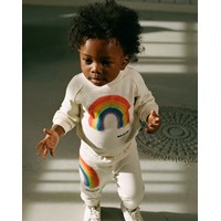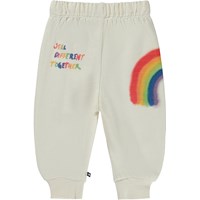 Hier ist die Babyhose Simeon, eine helle Babyhose mit einem Regenbogendruck auf der Seite eines Beins. Die Hose ist aus Baumwolle und hat einen elastischen Bund.