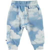 Simme ist eine weiche und bequeme Babyhose in Blau mit aufgedruckten Wolken. Die Hose hat Bindeband in der Taille und Taschen an den Seiten.