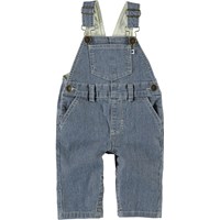 Sky sind ein Paar Baby-Lätzchenhosen in Blau mit schmalen weißen Streifen. Die Hosen schließen mit Knöpfen an der Seite und haben verstellbare Träger.