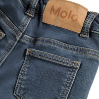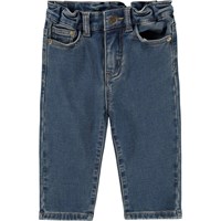 Blaue Jeans für die Kleinen aus dehnbarem weichem Baumwoll-Denim. Die Jeans haben eine lockere Passform, Knopf- und Reißverschluss sowie einen internen verstellbaren Gummizug für eine gute Passform.