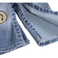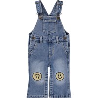 Blaue Denim-Latzhosen für die Kleinen aus Bio-Baumwolle mit langen Beinen. Die Hose hat dekorative Knie-Patches, verstellbare Träger und Druckknöpfe an den Seiten und zwischen den Beinen – aber nicht zwischen den Beinen in Größe 98/104. Sie sind in einem praktischen und bequemen Stil mit guter Bewegungsfreiheit.