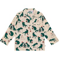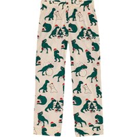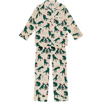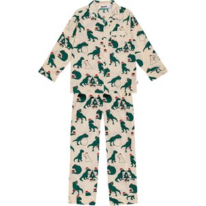 Beige und grünes Pyjama-Set mit langen Hosen und einem elastischen Bund mit Kordelzug. Das Oberteil hat lange Ärmel, einen Kragen, eine Brusttasche und Knöpfe auf der Vorderseite. Das Set hat eine normale Passform und ein Allover-Muster von Dinosauriern, die im Schnee spielen.