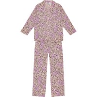 Lila und rosa Pyjama-Set mit langen Hosen und einem elastischen Bund mit Zugband. Das Oberteil hat lange Ärmel, einen Kragen, eine Brusttasche und Knöpfe vorne. Das Set hat ein Allover-Muster aus großen Blättern und kleinen Blumen. Es hat eine normale Passform.