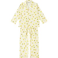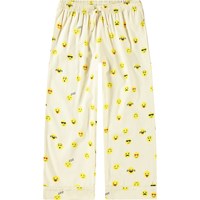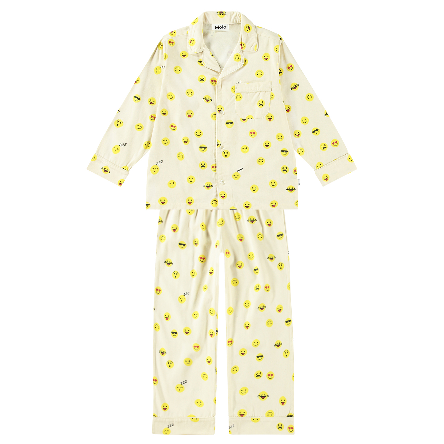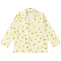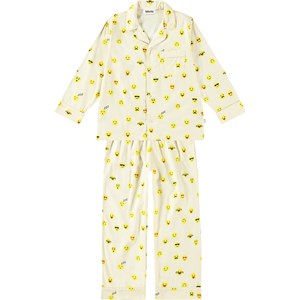 Helles Pyjama-Set mit langen Hosen und einem elastischen Bund mit Zugband. Das Oberteil hat lange Ärmel, einen Kragen, eine Brusttasche und Knöpfe auf der Vorderseite. Das Set hat einen Allover-Druck mit niedlichen, gelben Pixel-Emojis und hat eine normale Passform.