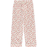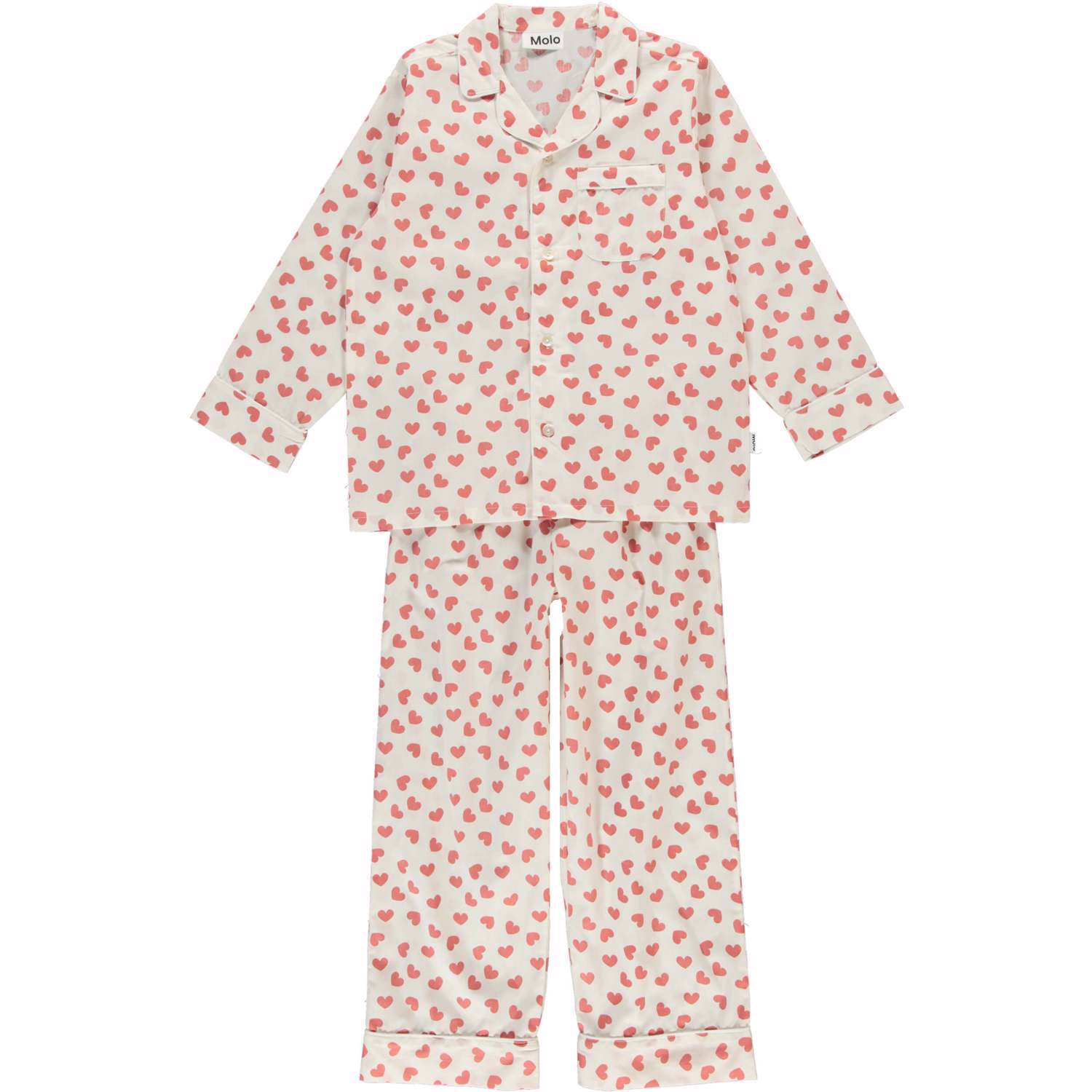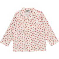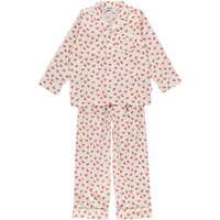Lex ist ein weißes Pyjama-Set mit Allover-Print aus roten Herzen. Lex hat weiße Gucklöcher und eine Brusttasche sowie Bindebänder und Gummizug in der Taille.