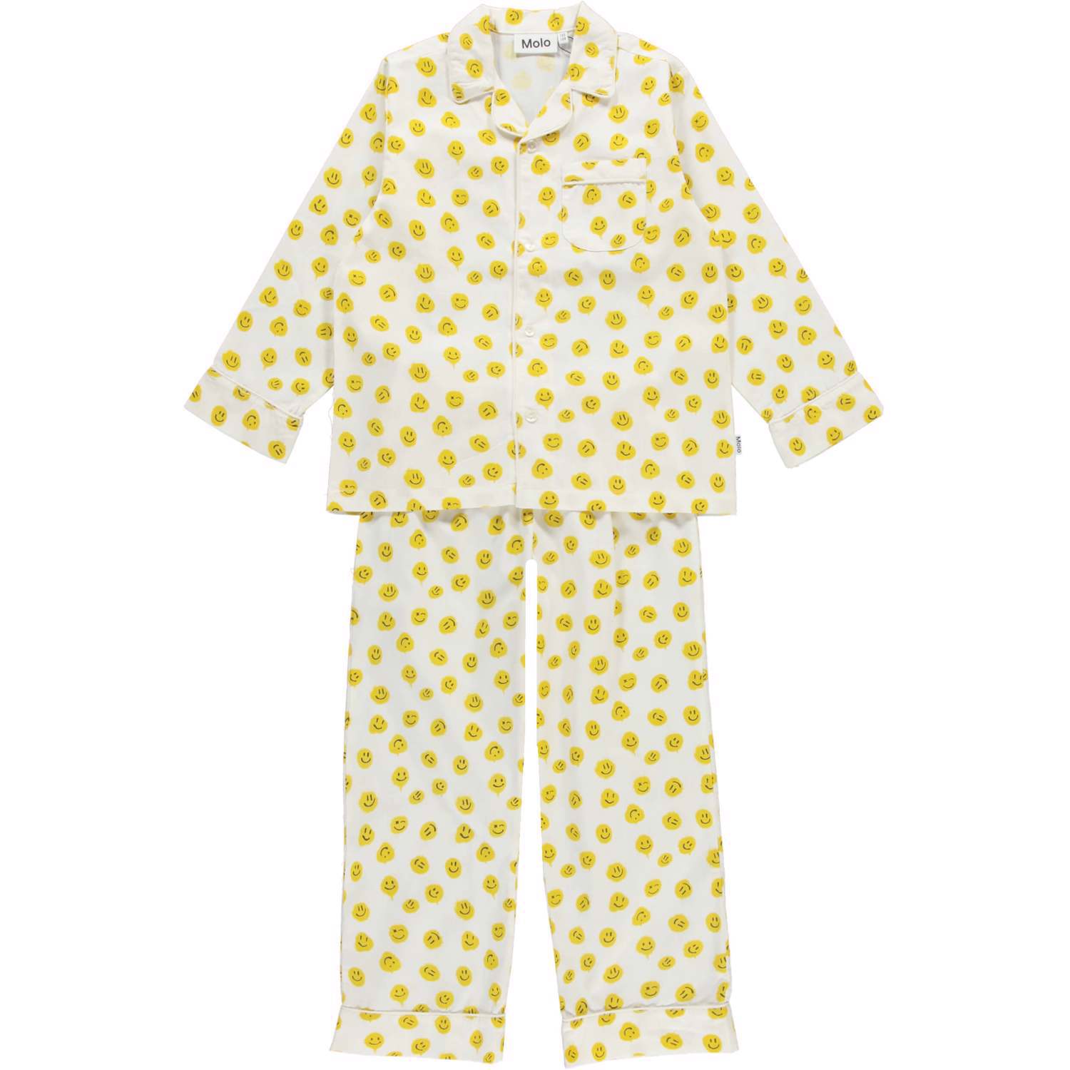 Lex ist ein weißes Pyjama-Set mit einem Allover-Print aus kleinen gesprühten Smileys. Lex hat weiße Gucklöcher und eine Brusttasche sowie Bindebänder und Gummizug in der Taille.
