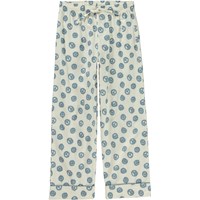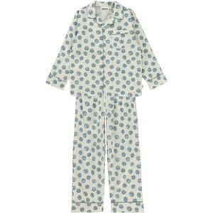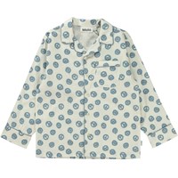 Lexi ist ein Nachtwäsche-Set in Weiß mit einem Aufdruck aus kleinen Peace-Zeichen und Smileys. Das Shirt hat lange Ärmel mit Knopfverschluss auf der Vorderseite. Die Hosen haben einen elastischen Bund mit Bändern.