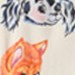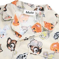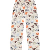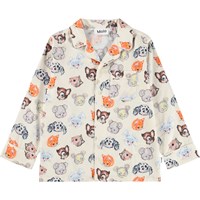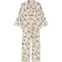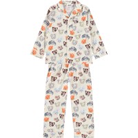 Pyjama-Set in Off-White aus Öko-Baumwolle. Die Hose hat lange Beine und einen elastischen Bund mit Kordelzug. Das Oberteil hat lange Ärmel, einen Kragen, eine Brusttasche und Knöpfe auf der Vorderseite. Das Pyjama-Set hat eine normale Passform und einen bunten Druck mit niedlichen gezeichneten Tieren.