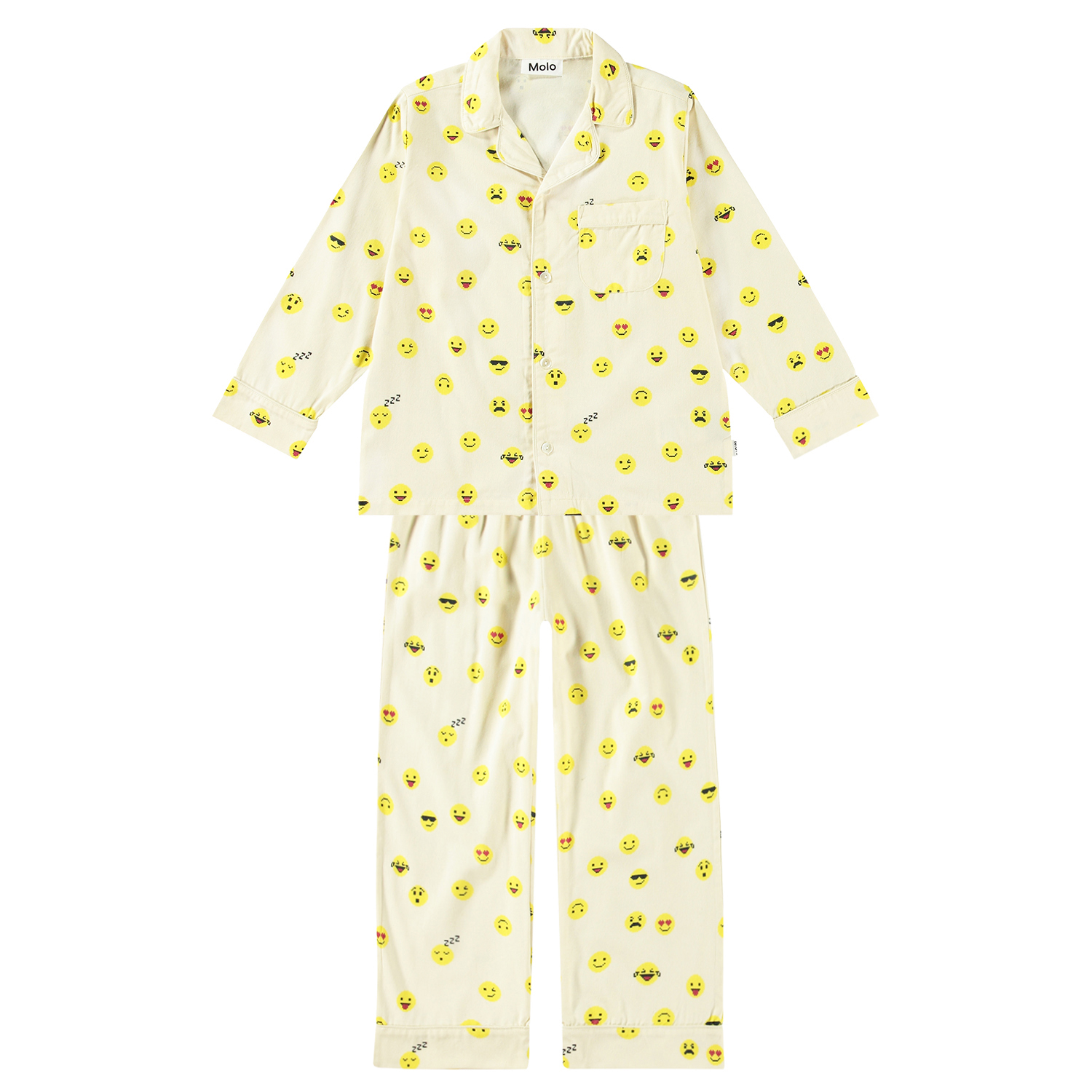 Helle Pyjama-Kombination aus Öko-Baumwolle mit langen Hosen und elastischem Bund mit Kordelzug. Das Oberteil hat lange Ärmel, einen Kragen, eine Brusttasche und Knöpfe auf der Vorderseite. Die Kombination hat ein Allover-Print von niedlichen, gelben Pixel-Emojis und hat eine reguläre Passform.