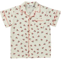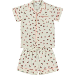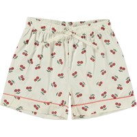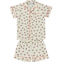 Lexi ist ein Nachtwäsche-Set in Weiß mit einem Aufdruck aus kleinen fröhlichen Kirschen. Das Shirt hat kurze Ärmel mit Knopfverschluss auf der Vorderseite. Die shorts hat einen elastischen Bund mit Bändern.