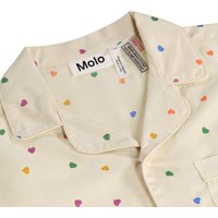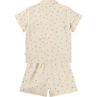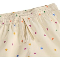 Beige zweiteilige Pyjamas aus weicher, biologischer Baumwolle mit kurzen Ärmeln und Beinen. Das Hemd hat einen Kragen und Knöpfe, und die Shorts haben einen Gummizug und eine Kordel am Bund. Das Set hat einen bunten Druck mit kleinen Herzen.