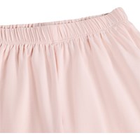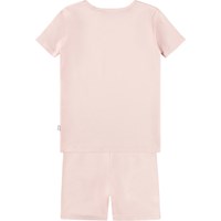 Rosa Pyjama mit kurzen Ärmeln und Beinen aus dehnbarem, weichem Bio-Baumwollstoff. Das Set ist zweiteilig und besteht aus einem lockeren T-Shirt mit Rundhalsausschnitt und einer Radlerhose mit elastischem Bund, die sie bequem zu tragen macht. Das Set hat einen Druck eines lächelnden weißen Gesichts.