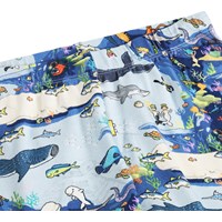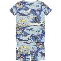 Blaue Pyjamas mit kurzen Ärmeln und Beinen aus dehnbarem, weichem Bio-Baumwollstoff. Das Set ist zweiteilig und besteht aus einem lockeren T-Shirt mit Rundhalsausschnitt und einer Radlerhose mit elastischem Bund, die sie bequem zu tragen macht. Das Set hat einen pixeligen Druck unter der Meeresoberfläche mit lustigen Fischen und fantasievollen Figuren.