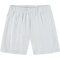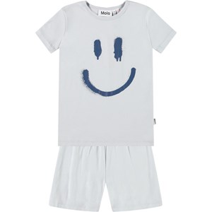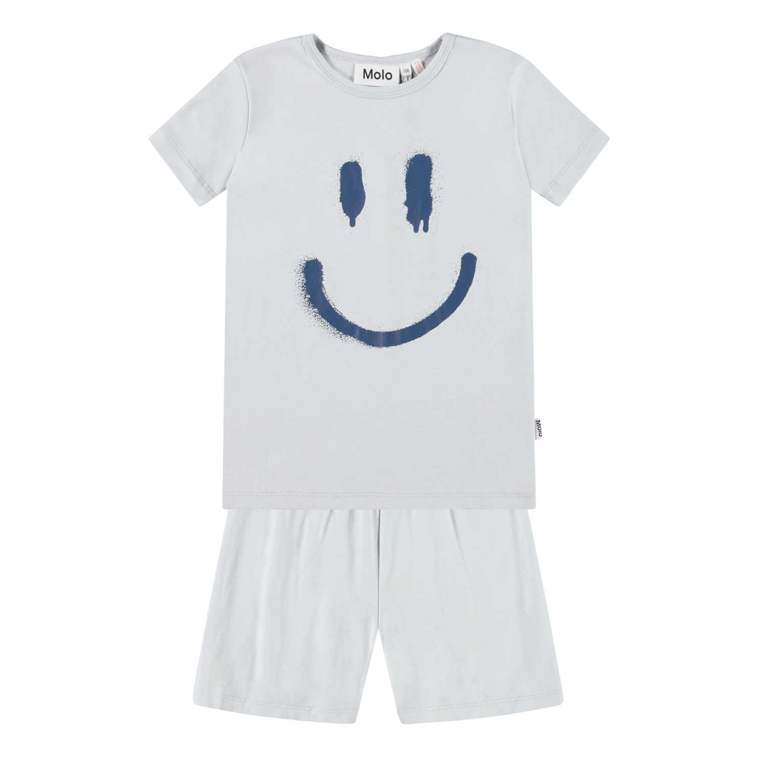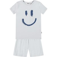 Hellblaue Pyjamas mit kurzen Ärmeln und Beinen aus dehnbarem Öko-Baumwolle. Das Set besteht aus einem lockeren T-Shirt mit Rundhalsausschnitt und einer Shorts mit elastischem Bund, die angenehm zu tragen sind. Das Set zeigt ein lächelndes dunkelblaues Gesicht auf der Vorderseite.