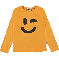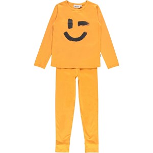 Zwei geteilte Nachtwäsche in Orange mit Smiley-Aufdruck auf dem Pullover. Die Hose hat Bindeband in der Taille und die Bluse hat lange Ärmel.