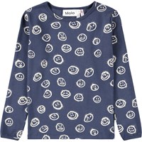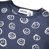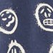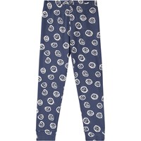 Dunkelblaues Pyjama-Set aus Öko-Baumwolle. Die Hose hat einen elastischen Bund und gerippte Bündchen an den Knöcheln. Das Oberteil hat einen runden Ausschnitt. Das Pyjama-Set hat einen weißen Aufdruck von Gesichtern mit verschiedenen Ausdrücken.