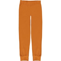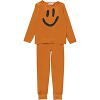 Zweiteiliges Nachtwäsche-Set in Orange mit Smiley-Print auf der Bluse. Die Hose hat Bänder in der Taille und das Oberteil hat lange Ärmel.