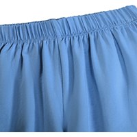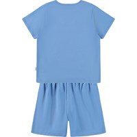 Blaue Pyjamas mit kurzen Ärmeln und Beinen aus dehnbarem, weichem Bio-Baumwollstoff. Das Set ist zweiteilig und besteht aus einem lockeren T-Shirt mit Rundhalsausschnitt und einer Shorts mit elastischem Bund, die sie angenehm zu tragen machen. Auf der Vorderseite des Sets befindet sich ein lächelndes weißes Gesicht.