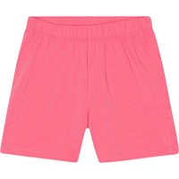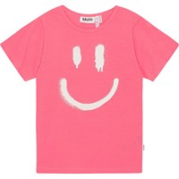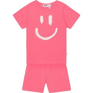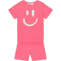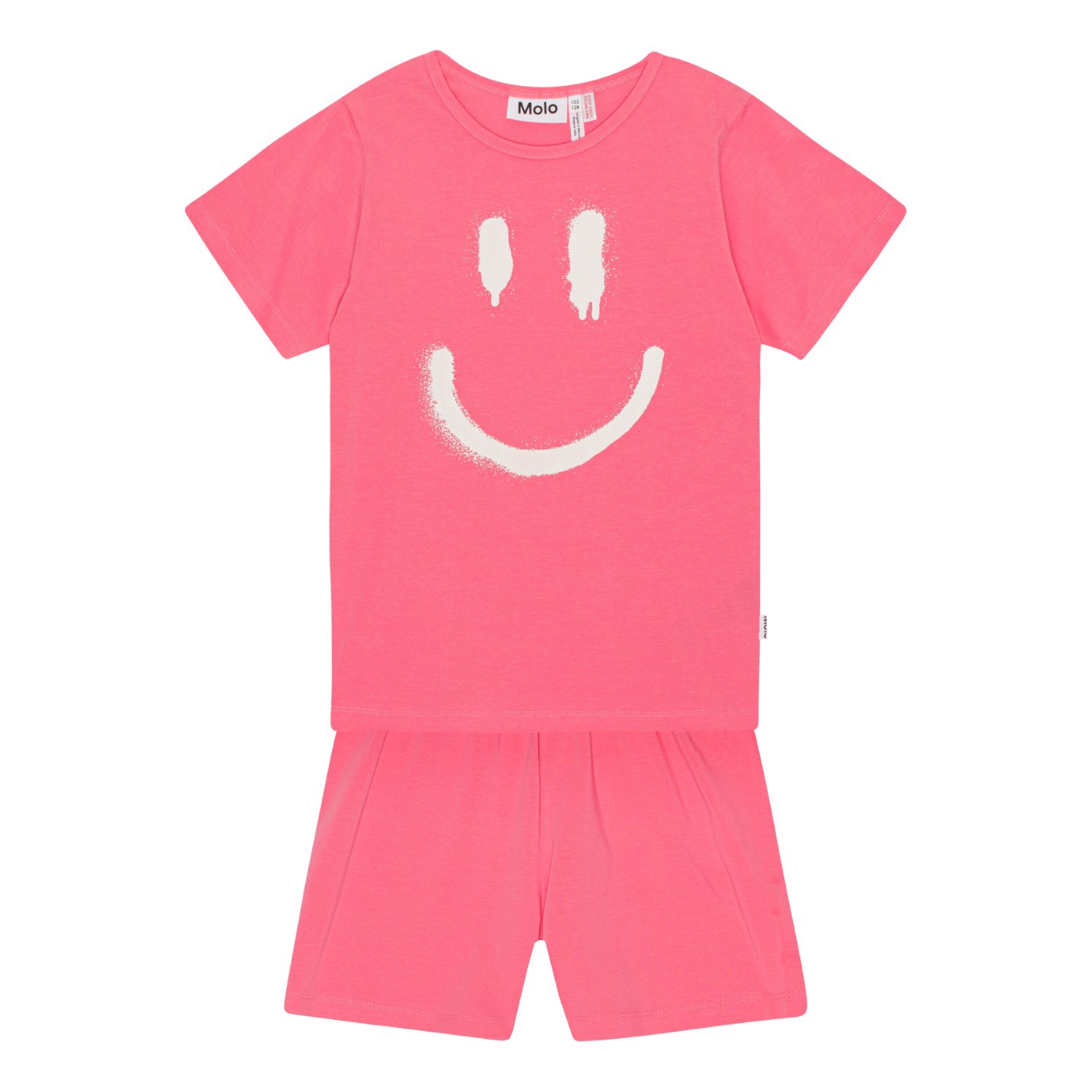 Rosafarbene Nachtwäsche mit Aufdruck eines lächelnden Gesichts aus Öko-Baumwolle. Die Nachtwäsche ist zweiteilig und besteht aus einem lockeren T-Shirt und einer Shorts mit Gummizug in der Taille.