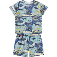 Blaue Pyjamas mit kurzen Ärmeln und Beinen aus dehnbarem, weichem Bio-Baumwollstoff. Das Set ist zweiteilig und besteht aus einem lockeren T-Shirt mit Rundhalsausschnitt und einer Shorts mit elastischem Bund, die sie angenehm zu tragen machen. Das Set hat einen pixeligen Druck unter der Meeresoberfläche mit lustigen Fischen und fantasievollen Figuren.