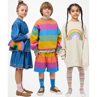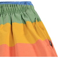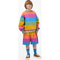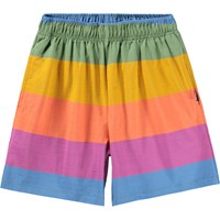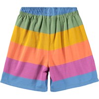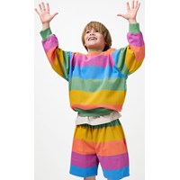 Shorts mit breiten Regenbogenstreifen aus Bio-Baumwolle. Die Shorts haben eine lockere Passform, mit Seitentaschen, Gesäßtaschen und einem elastischen Bund mit Kordelzug, die sie bequem und bewegungsfreundlich machen.