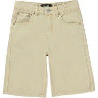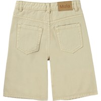 Art ist eine knielange Denim-Shorts in Beige. Die Shorts haben Taschen vorne und hinten und einen braunen Lederpatch mit Logo auf der Rückseite. Dieser Molo-Artikel ist aus zertifizierter Öko-Baumwolle hergestellt.