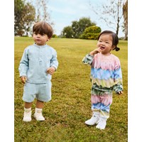 Jeansshorts aus Öko-Baumwolle für die Kleinen. Elastischer Bund und zwei Taschen. Sie sind hellblau mit einem kleinen bestickten lächelnden Gesicht. Kombinieren Sie sie mit einem passenden Hemd für ein komplettes Outfit.