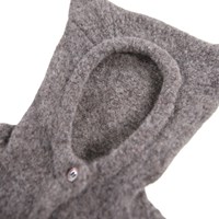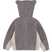 Grauer Strickjacke für die Kleinen aus einer weichen Wollmischung. Die Strickjacke hat eine Knopfleiste vorne, eine Kapuze mit Teddybärohren und gerippte Abschlüsse an den Ärmeln und am Saum. Kombinieren Sie sie mit der passenden Hose für ein komplettes Set.