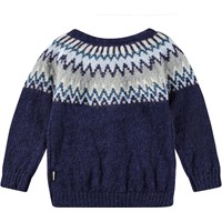 Dunkelblauer Strickcardigan mit nordisch inspiriertem Muster. Der Cardigan hat einen Rundhalsausschnitt mit geripptem Saum und gerippten Abschlüssen an Taille und Ärmeln. Er verfügt außerdem über einen Knopfverschluss entlang der Vorderseite.