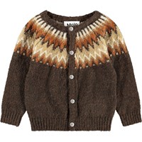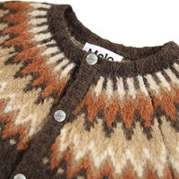 Dunkelbrauner gestrickter Cardigan für die Kleinen aus einer weichen Wollmischung mit einem von der nordischen Kultur inspirierten Muster. Der Cardigan hat einen Rundhalsausschnitt und gerippte Kanten am Hals, an der Taille und an den Ärmeln sowie einen Knopfverschluss vorne. Kombinieren Sie ihn mit der passenden Hose für ein komplettes Set.