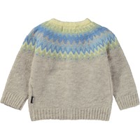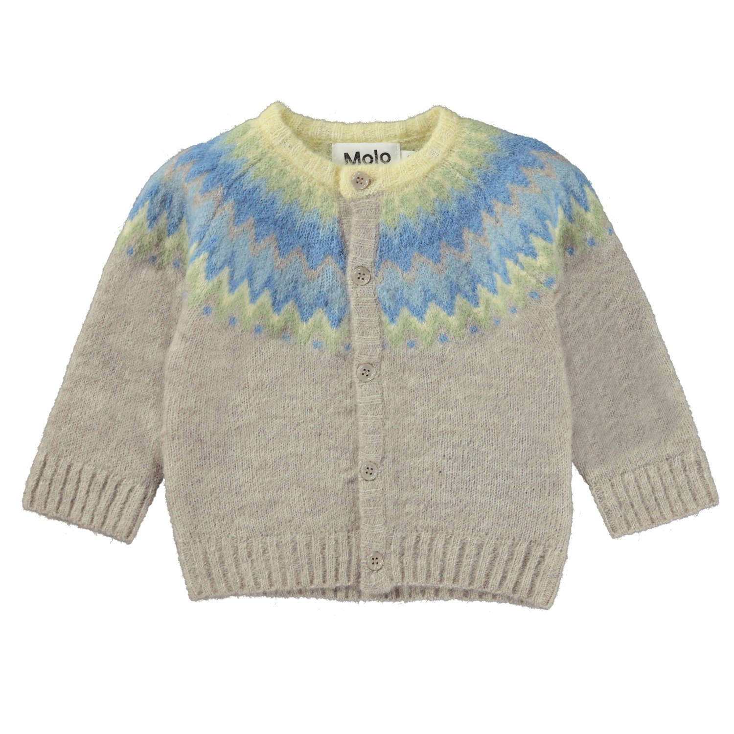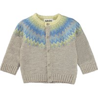 Beigefarbener Strick-Cardigan mit pastellfarbenem, nordisch inspiriertem Muster an Hals und Schultern. Dieser Cardigan ist aus einer schönen Alpaka-Wollmischung gefertigt, die sie perfekt für die kälteren Tage macht. Kombinieren Sie evt. diesen Cardigan mit der Hose Signy in gleicher Qualität für das perfekte Set.