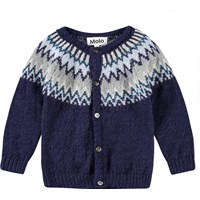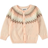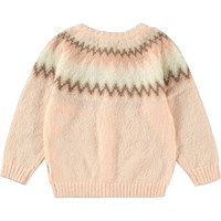 rosa gestrickte Strickjacke mit nordischem Muster. Runder Ausschnitt und gerippte Abschlüsse an Taille und Ärmeln. Knopfverschluss entlang der Vorderseite.