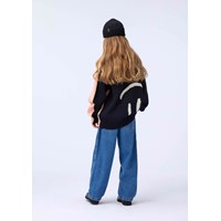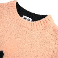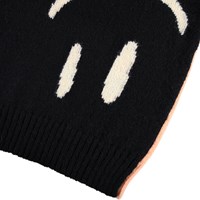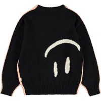 Rosa und schwarzer Strickpullover aus einer Alpakawollmischung. Der Pullover hat einen Rundhalsausschnitt mit gerippten Kanten sowie gerippte Bündchen und Saum. Er hat eine lockere Passform und kann mit der Vorder- oder Rückseite als Vorderseite getragen werden. Auf der Vorder- und Rückseite befinden sich große lächelnde Gesichter.