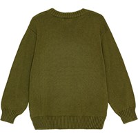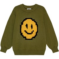 Grüner gestrickter Pullover aus Baumwolle/Wolle mit Rundhalsausschnitt, gerippten Bündchen und Saum. Der Pullover hat eine lockere Passform und ein Muster auf der Vorderseite. Auf der Vorderseite des Pullovers befindet sich ein großes lächelndes Pixelgesicht in Gelb mit schwarzer Umrandung.