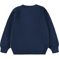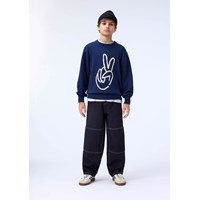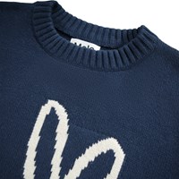 Dunkelblauer Strickpullover aus einer Mischung von Wolle und Baumwolle mit Rundhalsausschnitt sowie gerippten Bündchen und Saum. Er hat eine lockere Passform und ein großes handgezeichnetes Friedenszeichen-Muster.
