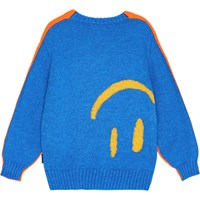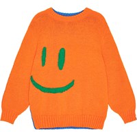 Orange und blauer gestrickter Pullover aus Alpaka/Acryl. Der Pullover hat einen Rundhalsausschnitt mit geripptem Abschluss sowie gerippte Bündchen und Saum. Er hat eine lockere Passform und kann mit der Vorder- oder Rückseite als Vorderseite getragen werden. Auf der Vorder- und Rückseite befinden sich große lächelnde Gesichter.