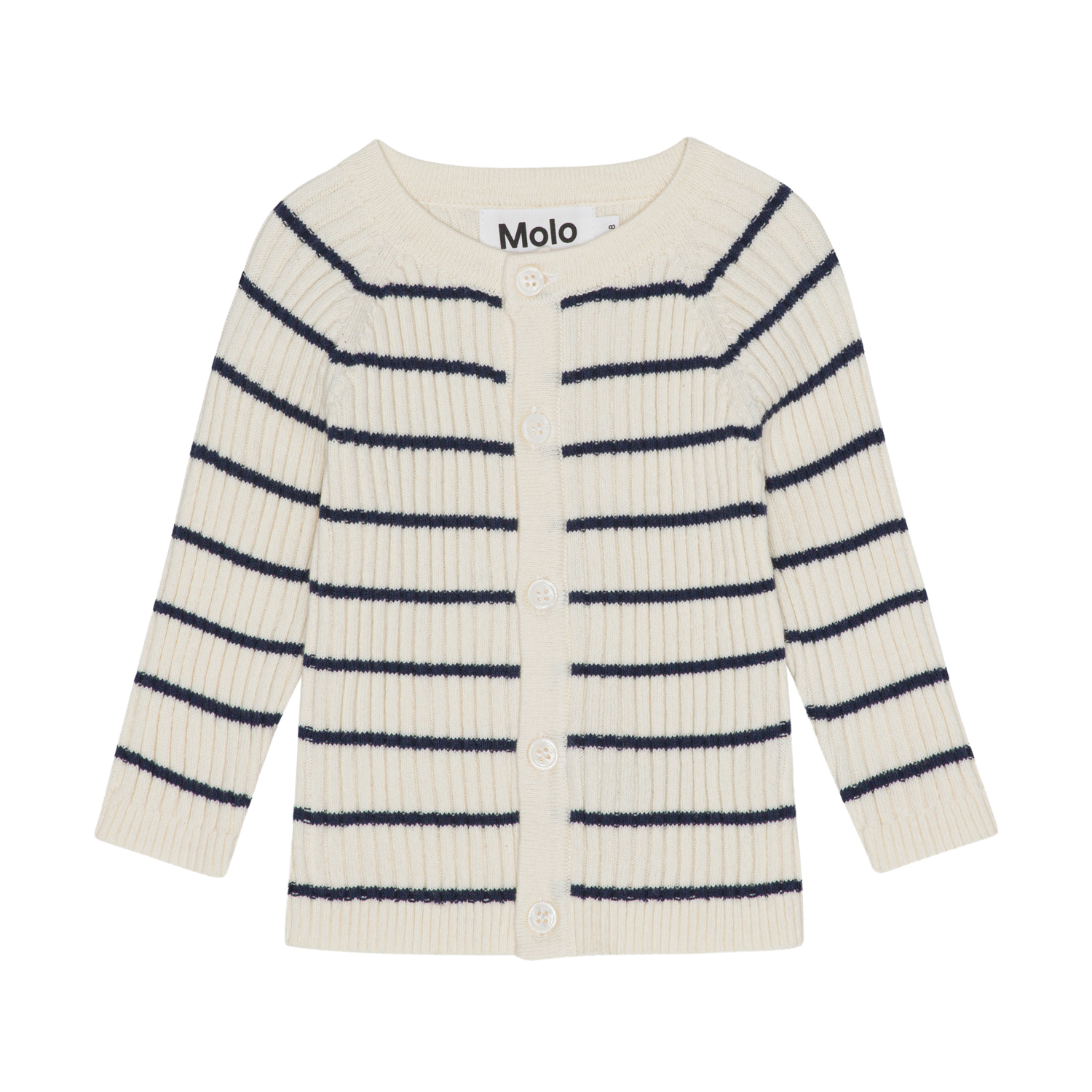 Weißer Cardigan in Rippstrick mit dunkelblauen Streifen für die Kleinen. Dieser Cardigan ist aus einer Baumwoll/Woll-Mischung gefertigt, hat einen Rundhalsausschnitt in Rippstrick, lange Ärmel mit Raglanschnitt, einen Knopfverschluss auf der Vorderseite und Rippstrick an Ärmeln und Hüfte. Kombinieren Sie evt. diesen Cardigan mit der Hose Sigmund in gleicher Qualität für das perfekte Set.