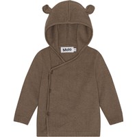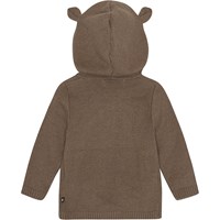 Brauner Strickpullover mit Kapuze für die Kleinen. Dieser Strickpullover ist aus einer weichen Baumwoll/Woll-Mischung gefertigt, hat lange Ärmel, wird vorne mit 3 Knöpfen geschlossen, niedliche Bärenohren an der Kapuze und Rippbündchen an Handgelenken und Hüften.