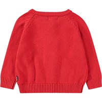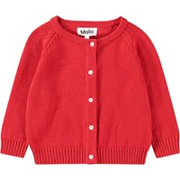 Roter Strick-Cardigan aus Baumwolle/Wolle für die Kleinen. Der Cardigan hat einen runden Halsausschnitt mit geripptem Saum, gerippten Saum an Taille und Ärmeln und eine Knopfleiste entlang der Vorderseite.