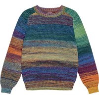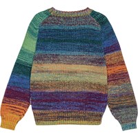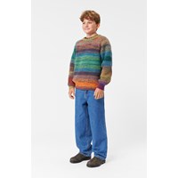 Bunter Pullover mit Raglanärmeln und Rundhalsausschnitt. Der Pullover hat gerippte Details am Ausschnitt, den Ärmeln und im Taillenbereich. Er hat eine normale Passform.