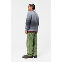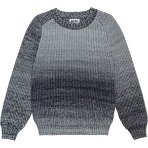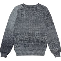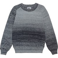 Grauer gestrickter Pullover mit Verlaufseffekt. Der Pullover hat Raglanärmel und einen Rundhalsausschnitt mit Rippstrick. Es gibt auch Rippstrick an den Ärmeln und im Hüftbereich. Der Pullover hat eine normale Passform.