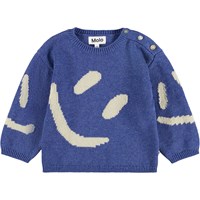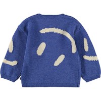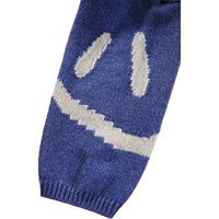 Blauer gestrickter Pullover für die Kleinen aus einer weichen Baumwoll- und Wollmischung mit weißen lächelnden Gesichtern. Der Pullover hat eine lockere Passform und einen Knopfverschluss an der Schulter, um das Anziehen zu erleichtern. Kombinieren Sie ihn mit der passenden Hose für ein komplettes Set.