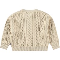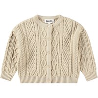 Hellbeige gestrickte Strickjacke aus Baumwolle/Wolle für die Kleinen. Die Strickjacke hat feine Zopfmusterdetails und einen Rundhalsausschnitt mit geripptem Abschluss. Es gibt auch gerippte Abschlüsse an der Taille und den Ärmeln sowie einen Knopfverschluss entlang der Vorderseite.