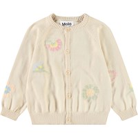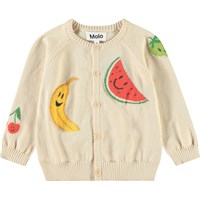 Strickjacke für die Kleinen aus Öko-Baumwolle. Die Strickjacke hat Raglanärmel, gerippte Kanten und einen runden Ausschnitt. Die Strickjacke ist beige mit fröhlichen Früchten. Kombinieren Sie sie mit der passenden Hose für ein komplettes Outfit.