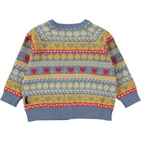 Brody ist eine Baby-Strickjacke aus Baumwolle mit vielen farbigen Streifen, in denen sowohl Herzen als auch Peace-Zeichen und Smileys versteckt sind. Die Strickjacke hat einen Knopfverschluss auf der Vorderseite. Kombinieren Sie die Strickjacke mit der passenden Babyhose.