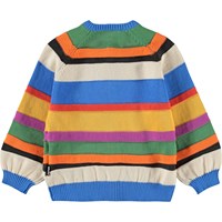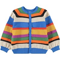 Mehrfarbige Strickjacke für die Kleinen aus Bio-Baumwolle mit Streifen. Die Strickjacke hat Raglanärmel, gerippte Kanten und einen runden Halsausschnitt.