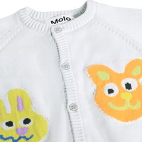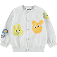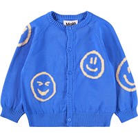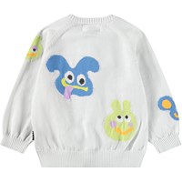 Hellblauer Strick-Cardigan für die Kleinen aus Bio-Baumwolle mit lustigen Figuren. Der Cardigan hat Raglanärmel, gerippte Kanten und einen runden Halsausschnitt.